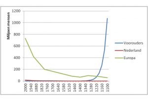 Dan zouden alle “Nederlanders” aan het eind van de Middeleeuwen (tussen 1400 en 1500) een voorouder van je zijn. Immers in die periode heb je ongeveer net zoveel voorouders als er mensen woonden in “Nederland”.