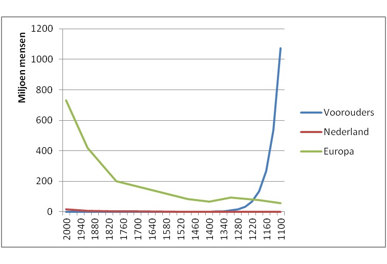 Naar schatting leefden er rond het jaar 1100 zo’n 55 miljoen mensen in heel Europa (incl. Rusland). Hoe kan het dan dat je in die tijd ruim 1 miljard voorouders moet hebben gehad? De conclusie moet zijn dat je heel veel keer van elk van die 55 miljoen mensen afstamt. Theoretisch meer dan 18 keer.