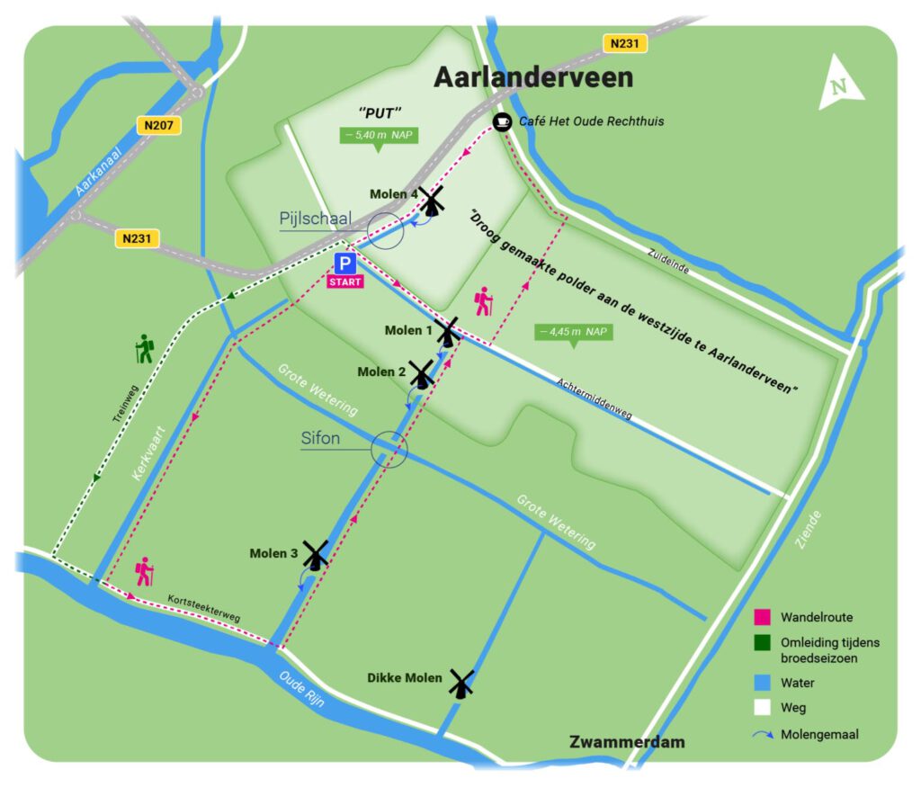 De molenviergang in Aarlanderveen is de enige molenviergang in de wereld die (doorgaans zonder mechanische hulp) een polder bemaalt. Als het nodig is worden de elektrische hulpgemalen, die stammen uit 1994, ingezet zoals bij windstilte of als een van de molens buiten gebruik is.